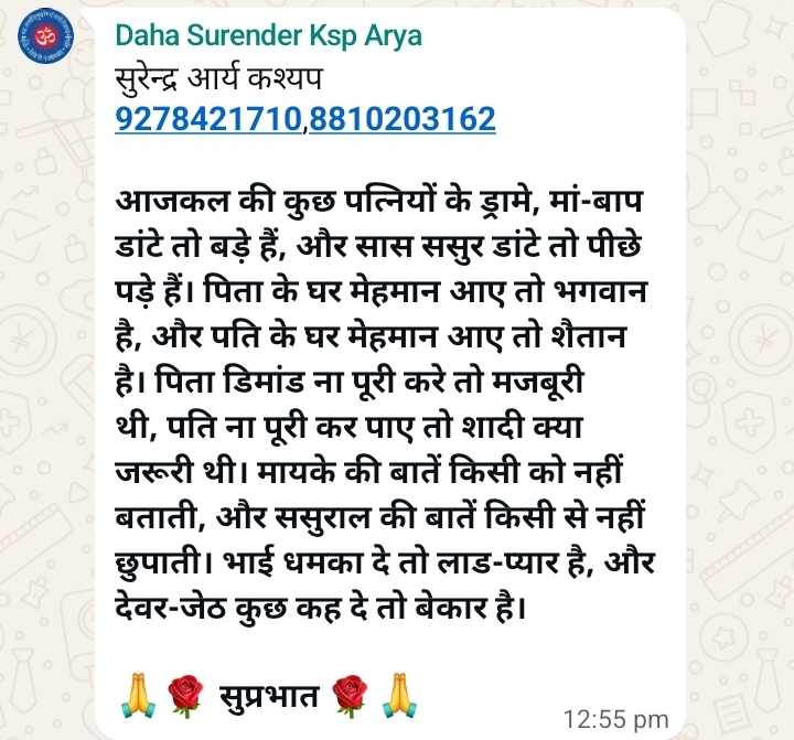 आजकल की कुछ पत्नियों के ड्रामे, मां-बाप डांटे तो बड़े हैं, और सास ससुर डांटे तो पीछे पड़े हैं। पिता के घर मेहमान आए तो भगवान है, और पति के घर मेहमान आए तो शैतान है। पिता डिमांड ना पूरी करे तो मजबूरी थी, पति ना पूरी कर पाए तो शादी क्या जरूरी थी। मायके की बातें किसी को नहीं बताती, और ससुराल की बातें किसी से नहीं छुपाती। भाई धमका दे तो लाड-प्यार है, और देवर-जेठ कुछ कह दे तो बेकार है।