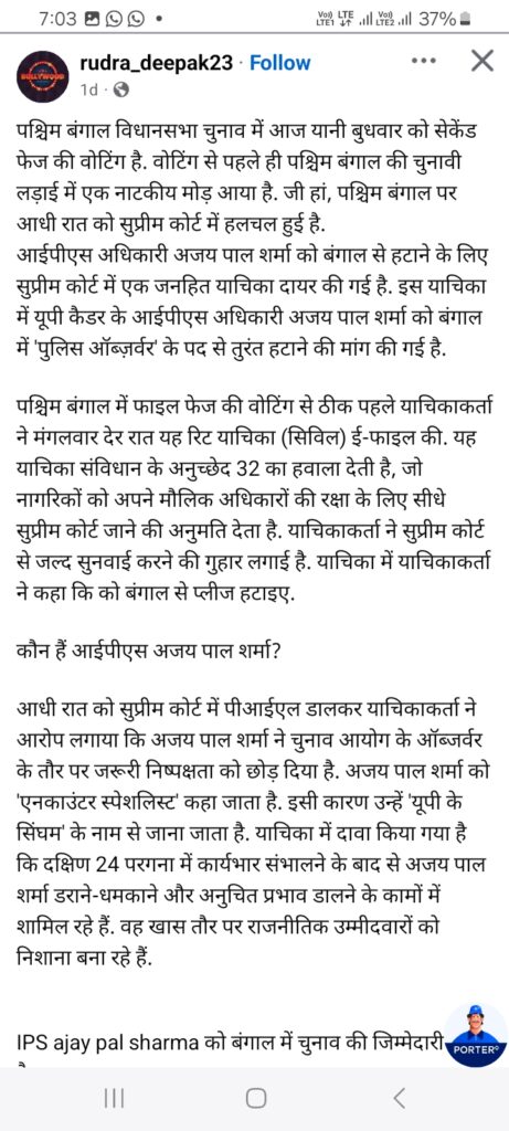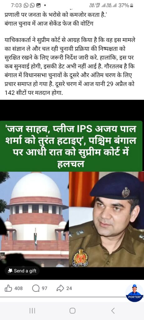 पश्चिम बंगाल में फाइल फेज की वोटिंग से ठीक पहले याचिकाकर्ता ने मंगलवार देर रात यह रिट याचिका (सिविल) ई-फाइल की. यह याचिका संविधान के अनुच्छेद 32 का हवाला देती है, जो नागरिकों को अपने मौलिक अधिकारों की रक्षा के लिए सीधे सुप्रीम कोर्ट जाने की अनुमति देता है. याचिकाकर्ता ने सुप्रीम कोर्ट से जल्द सुनवाई करने की गुहार लगाई है. याचिका में याचिकाकर्ता ने कहा कि को बंगाल से प्लीज हटाइए.