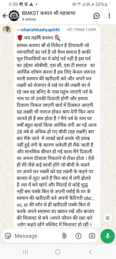 рд╕рдорд╕реНрдд рдХрд╢реНрдпрдк рд╢реНрд░реА рд╕реЗ рдирд┐рд╡реЗрджрди рд╣реИ рджреАрдкрд╛рд╡рд▓реА рдЬреЛ рд╡реНрдпрд╛рдкрд╛рд░рд┐рдпреЛрдВ рдХрд╛ рдкрд░реНрд╡ рд╣реИ рдЬреЛ рд╡реИрд╢реНрдп рд╕рдорд╛рдЬ рд╣реИ рдмрд╛рдХреА рдореВрд▓ рдирд┐рд╡рд╛рд╕рд┐рдпреЛрдВ рдХрд╛ рдпреЗ рдХреЛрдИ рдкрд░реНрд╡ рдирд╣реАрдВ рд╣реИ рдЗрд╕ рдкрд░реНрд╡ рдХрд╛ рдЙрджреНрджреЗрд╢реНрдп рдУрдмреАрд╕реА, рдПрд╕ рд╕реА, рдПрд╕ рдЯреА рд╕рдорд╛рдЬ рдХрд╛ рдЖрд░реНрдерд┐рдХ рд╢реЛрд╖рдг рдХрд░рдирд╛ рд╣реИ рдЗрд╕ рд▓рд┐рдП рдХреЗрд╡рд▓ рдЬрд░реВрд░рдд рд╡рд╛рд▓реА рд╕рд╛рдорд╛рди рдХреА рдЦрд░реАрджрд╛рд░реА рдХрд░реЗ рдФрд░ рдЕрдкрдиреЗ рдзрди рд▓рдХреНрд╖реНрдореА рдХреЛ рд░реЛрдЬрдЧрд╛рд░ рдореЗрдВ рд░рдЦреЗ рдШрд░ рдХреА рд▓рдХреНрд╖реНрдореА рдШрд░ рдореЗрдВ рд░рд╣реЗ рдЬрдм рд╡рд╣ рдмрдирд┐рдП рдХреЗ рдкрд╛рд╕ рдкрд╣реБрдВрдЪ рдЬрд╛рдПрдЧреА рдкрд░реНрд╡ рдХреЗ рдирд╛рдо рдкрд░ рддреЛ рдЙрдирдХреА рджрд┐рд╡рд╛рд▓реА рд╣реЛрдЧреА рдФрд░ рд╣рдорд╛рд░рд╛ рджрд┐рд╡рд╛рд▓рд╛ рдирд┐рдХрд▓ рдЬрд╛рдПрдЧреА рдЦрд░реНрдЪ рдореЗрдВ рджрд┐рдХреНрдХрдд рдЖрдПрдЧреА рдЧреНрд░рд╣ рд▓рдХреНрд╖реНрдореА рднреА рдирд╛рд░рд╛рдЬ рд╣реЛрдХрд░ рд╢реНрд░рд╛рдк рджреЗрдЧреА рдлрд┐рд░ рдЖрдк рдЬрд╛рдирддреЗ рд╣реА рд╣реИ рдХреНрдпрд╛ рд╣реЛрддрд╛ рд╣реИ ? рдореИрдиреЗ рдкрд░реНрд╡ рдХреЗ рдирд╛рдо рдкрд░ рд╡рд░реНрд╖реЛрдВ рдмрд╣реБрдд рдЦрд░реНрдЪрд╛ рдХрд┐рдпрд╛ рдЖрд░реНрдерд┐рдХ рддрдВрдЧреА рдЖ рдЧрдИ рдЖрдЬ 28 рд╡рд░реНрд╖ рд╕реЗ рдЕрдзрд┐рдХ рд╣реЛ рдЧрдП рдмреАрд╡реА (рдЧреНрд░рд╣ рд▓рдХреНрд╖реНрдореА) рдмрд╛рд░ рдмрд╛рд░ рдореИрдХреЗ рдЬрд╛рдиреЗ рдореЗрдВ рд▓рд╛рдЦреЛрдВ рдЦрд░реНрдЪ рдХрд░рдХреЗ рднреА рдкреНрд░рд╕рдиреНрди рдирд╣реАрдВ рд╣реБрдИ рддрдВрдЧреА рдХреЗ рдХрд╛рд░рдг рдЕрдХреЗрд▓реА рд╣реА рдореИрдХреЗ рдЬрд╛рддреА рд╣реИ рдФрд░ рдорд╛рдирд╕рд┐рдХ рдмреАрдорд╛рд░ рд╣реЛ рдЧрдИ рдХрд╛рд╢ рдореИрдиреЗ рджрд┐рд╡рд╛рд▓реА рдкрд░ рдЕрдкрдирд╛ рджреАрд╡рд╛рд▓рд╛ рдирд┐рдХрд▓рдиреЗ рд╕реЗ рд░реЛрдХрд╛ рд╣реЛрддрд╛ ред рдРрд╕реЗ рд╣реА рдореЗрд░реЗ рдЬреИрд╕реЗ рдХрдИ рд╕рд╛рдереА рд╣реЛрдВрдЧреЗ рдЬреЛ рдмреАрд╡реА рдХреЗ рдХрд╣рдиреЗ рдкрд░ рдЕрдкрдиреЗ рдзрди рд▓рдХреНрд╖реНрдореА рдХреЛ рдЧреНрд░рд╣ рд▓рдХреНрд╖реНрдореА рдХреЗ рдХрд╣рдиреЗ рдкрд░ рдмрд╛рдЬрд╛рд░ рдореЗрдВ рд▓реВрдЯрд╛ рдЖрддреЗ рд╣реИ рдлрд┐рд░ рдмрд╛рдж рдореЗрдВ рддрдВрдЧреА рдЭреЗрд▓рддреЗ рд╣реИ редрдШрд░ рдореЗрдВ рдмрдиреЗ рдЦрд╛рдиреЗ рдФрд░ рдорд┐рдард╛рдИ рд╕реЗ рдХреЛрдИ рд╢реБрджреНрдз рдирд╣реАрдВ рдмрд╕ рдкрдХреНрдХреЗ рдмрд┐рд▓ рд╕реЗ рдЕрдкрдиреА рд░рд╕реЛрдИ рдХреЗ рдШрд░ рдХреЗ рд╕рд╛рдорд╛рди рдХреА рдЦрд░реАрджрд╛рд░реА рдХрд░реЗ рдЕрдкрдиреА рдХреИрдЯрд┐рдЧрд░реА obc , sc, st рдХреА рд╢реЙрдк рд╕реЗ рд╣реА рдЦрд░реАрджрд╛рд░реА рдкрдХреНрдХреЗ рдмрд┐рд▓ рд╕реЗ рдХрд░рдХреЗ рдЕрдкрдиреЗ рд╕реНрд╡рд╛рд╕реНрдереНрдп рдХрд╛ рдЦреНрдпрд╛рд▓ рд░рдЦреЗрдВ рдФрд░ рдмрд╛рдЬрд╛рд░ рдХреА рдорд┐рд▓рд╛рд╡рдЯ рд╕реЗ рдмрдЪреЗ редрдЕрдкрдиреЗ рдЬреАрд╡рди рдХреА рд░рдХреНрд╖рд╛ рдХрд░реЗ редрд▓реЛрдЧ рдХрд╣рддреЗ рд░рд╣реЗрдВрдЧреЗ рдорд╕реНрдЬрд┐рдж рдореЗрдВ рдорд┐рд▓рд╛рд╡р
