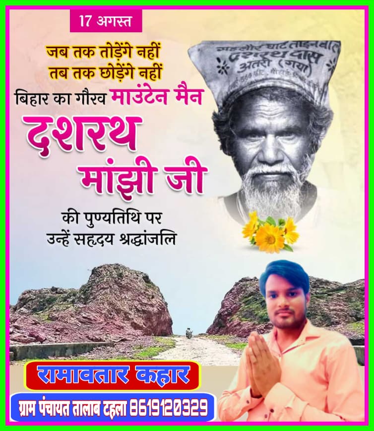 दशरथ मांझी जी सा ज़िद्दी कठोर और संघर्षशील आदमी की धरती पर आज तक पैदा नहीं उसने अपने 22 साल की कठोर मेहनत के दम पर एक एक पत्थर को छैनी से तोड़कर गांव वालों के लिए रास्ता बनाएं था ज्ञात हो कि दशरथ मांझी जी की पत्नी बहुत बीमार हो गईतीज आस पास कोई अस्पताल नहीं था तथा अस्पताल में ले जाने के लिए बहुत दूर से होकर जाना पड़ता था दशरथ मांझी जब अपनी पत्नी को अस्पताल ले जाने लगे तो क रास्ते में ही मौत हो गई इससे उन्हें बहुत दुख हुआ तब उन्होंने प्रण लिया कि आगे भविष्य में कोई भी आदमी दूर अस्पताल पहुंचने के कारण नहीं मरेगा तब उन्होंने अपने 22 साल की कठोर मेहनत से गांव वालों के लिए पत्थर का सीना चीरकर रास्ता बनाया था आज दशरथ मांझी जी पूरे देश में पर्वत पुरुष यानी माउंटेन मैन के नाम से जाने जाते हैं ऐसी दिवंगत आत्मा के चरणो में कोटि-कोटि नमन 🙏💐🌹💫