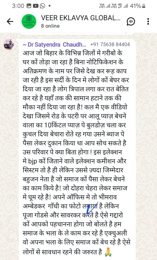 आज जो बिहार के विभिन्न जिलों मे गरीबो के घर कों तोड़ा जा रहा है बिना नोटिफिकेशन के अतिक्रमण के नाम पर जिसे देख कर रूह काप जा रही है इस सर्दी के दिन मे लोगों कों बेघर कर दिया जा रहा है लोग त्रिपाल लगा कर रात बेतित कर रहे है यहाँ तक की सामान हटाने तक की मौका नहीं दिया जा रहा है! कल मै एक वीडियो देखा जिसमे रोड के पटरी पर आलू प्याज़ बेचने वाला का 10किंटल प्याज़ पे बुलडोज़ चला कर कुचल दिया बेचारा रोते रह गया उसने ब्याज पे पैसा लेकर दुकान किया था आप सोच सकते है उस परिवार पे क्या बिता होगा ! इस इलेक्शन मे bjp कों जिताने वाले इलेक्शन कमीशन और सिस्टम तो है ही लेकिन उससे ज़्यदा जिम्मेदार बहुजन नेता है जो समाज कों पैसा लेकर बेचने का काम किये है! जो दोहरा चेहरा लेकर समाज मे घूम रहे है! अपने ऑफिस मे तो भीमराव अम्बेडकर गाँधी का फोटो लगाया है लेकिन पूजा गोडसे और सावरकर करते है ऐसे गद्दारो कों आपको पहचानना होगा जो बोलते है हम समाज के भला के ले काम कर रहे है एक्चुअली वो अपना भला के लिए समाज कों बेच रहे है ऐसे लोगों से सावधान रहने की जरुरत है 🙏