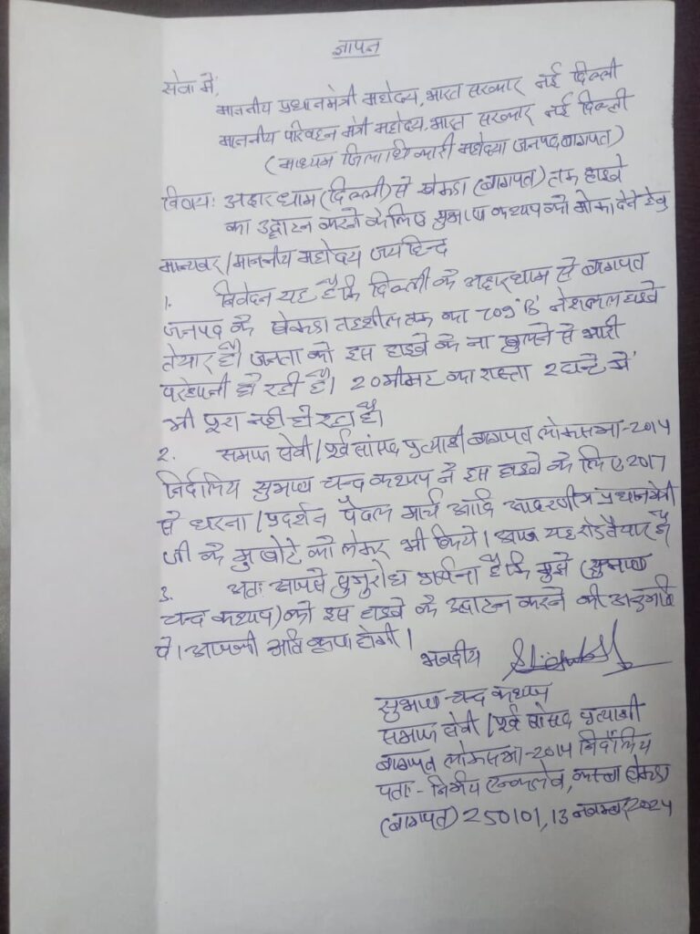 दिल्ली अक्षरधाम से लेकर देहरादून तक का हाईवे बन रहा है इसमें दिल्ली अक्षरधाम से लेकर लोनी होते हुए खेकड़ा तहसील तक का हाईवे और एलिवेटेड रोड बनकर तैयार है जिसका उद्घाटन पिछले दो वर्षों से पेंडिंग था पिछले महीने 13.11.2025 को ही देश के प्रधानमंत्री आदरणीय मोदी जी और परिवहन मंत्री भारत सरकार के नाम एक ज्ञापन जिलाधिकारी महोदय जनपद बागपत को दिया गया था मेरे द्वारा सुभाष चंद्र कश्यप के द्वारा जिसमें मैंने मांग की थी कि 15 दिसंबर तक इस रोड का उद्घाटन कर दिया जाए अन्यथा की स्थिति में 15 दिसंबर के बाद इस रोड के उद्घाटन की अनुमति मुझे प्रदान की जाए जिससे इस रोड को शुरू कर दिया जाए लिखित में कोई जवाब ना आने पर समझ जाएगा कि सुभाष चंद्र कश्यप को इस हाइवे को शुरू करने की उद्घाटन करने की अनुमति स्वीकृति प्रदान कर दी गई।