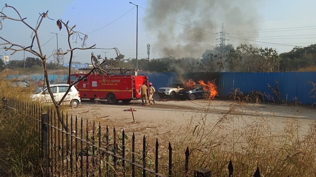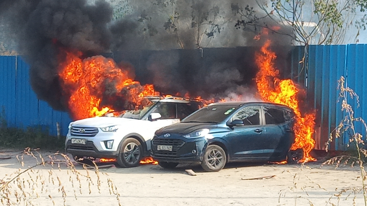 दिल्ली के जसोला में दो कर में भयंकर आग लग गई। बताना चाहूंगा कि कार पार्किंग स्थल पर दो कार खड़ी हुई थी पास में ही घास बड़ी-बड़ी खड़ी थी। ना जाने आग कहां से एक गाड़ी में लगी और एक गाड़ी ने दूसरी को जला दिया दूसरी गाड़ी भी इस गाड़ी की चपेट में आ गई हजारों का हजम जलती हुई गाड़ियों की फोटो वीडियो बनाने लगे। ऑफिस आदि से बाहर निकाल कर लोग देखने लगे।