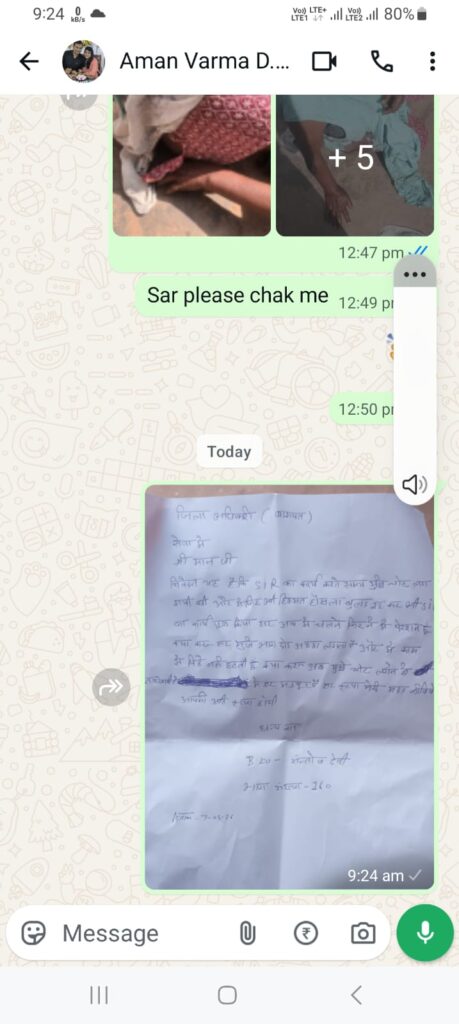अब बताना चाहूंगा की बीएलओ संतोष निवासी ढीकाना तहसील बड़ौत थाना बड़ौत जनपद बागपत पर बीएलओ के कार्य के लिए इतने दबाव दिए कि चलते राह रोड पर भी चेन से चलने नहीं दिया। बीएलओ संतोष चलती हुई भी फोन अटेंड करना उनकी मजबूरी बन गई। बार-बार अधिकारियों के फोन आए बीएलओ के कार्य पूरे करने का दबाव बनाया गया और इसी बीच सड़क पर चलते हुए संतोष को कोई वाहन घसीट कर चला गया जिससे बीएलओ संतोष को काफी चोट आई और बेहोश होकर वहीं रोड पर गिर गई। बड़ौत के सरकारी अस्पताल में इलाज करवाया और उसके बावजूद भी बीएलओ का कार्य पूरा किया।