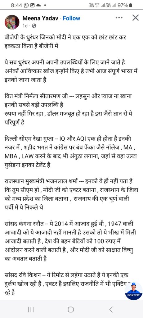 सांसद कंगना रनौत — ये 2014 में आजाद हुई थी , 1947 वाली आजादी को ये आजादी नहीं मानती है उसको तो ये भीख में मिली आजादी बताती है , देश की बहन बेटियों को 100 रुपए में आंदोलन करने वाली बताती है , और मोदी जी को साक्षात विष्णु का अवतार बताती है