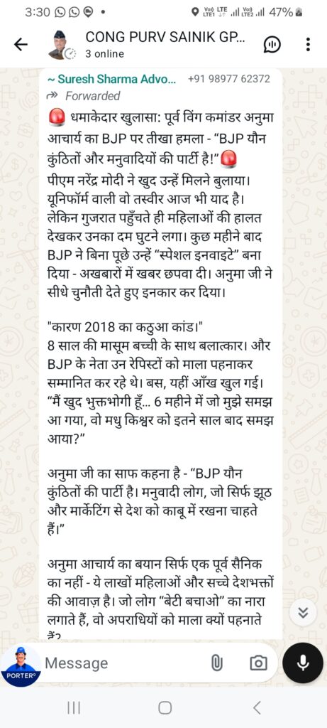 рдЕрдиреБрдорд╛ рдЖрдЪрд╛рд░реНрдп рдХрд╛ рдмрдпрд╛рди рд╕рд┐рд░реНрдл рдПрдХ рдкреВрд░реНрд╡ рд╕реИрдирд┐рдХ рдХрд╛ рдирд╣реАрдВ – рдпреЗ рд▓рд╛рдЦреЛрдВ рдорд╣рд┐рд▓рд╛рдУрдВ рдФрд░ рд╕рдЪреНрдЪреЗ рджреЗрд╢рднрдХреНрддреЛрдВ рдХреА рдЖрд╡рд╛рдЬрд╝ рд╣реИред рдЬреЛ рд▓реЛрдЧ тАЬрдмреЗрдЯреА рдмрдЪрд╛рдУтАЭ рдХрд╛ рдирд╛рд░рд╛ рд▓рдЧрд╛рддреЗ рд╣реИрдВ, рд╡реЛ рдЕрдкрд░рд╛рдзрд┐рдпреЛрдВ рдХреЛ рдорд╛рд▓рд╛ рдХреНрдпреЛрдВ рдкрд╣рдирд╛рддреЗ рд╣реИрдВ?