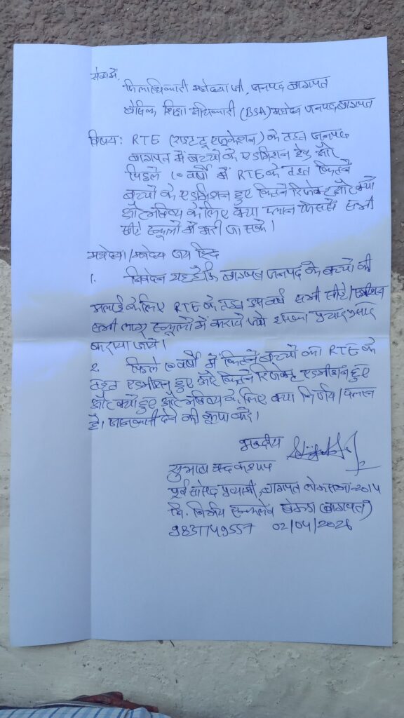 दूसरे पत्र में सुभाष चंद कश्यप नहीं मांगती है कि बागपत जनपद में राइट टू एजुकेशन के तहत पिछले 10 वर्षों में कितने बच्चों के स्कूलों में बेसिक शिक्षा विभाग ने एडमिशन कराए और कितनों बच्चों के एडमिशन रिजेक्ट हुए कितनों के आवेदन आए थे और इस वर्ष कितनी जागरूकता फैलाई जा रही है जिससे राइट टू एजुकेशन के तहत प्राइवेट स्कूलों में बच्चों का राइट टू एजुकेशन के तहत एडमिशन हो सके।