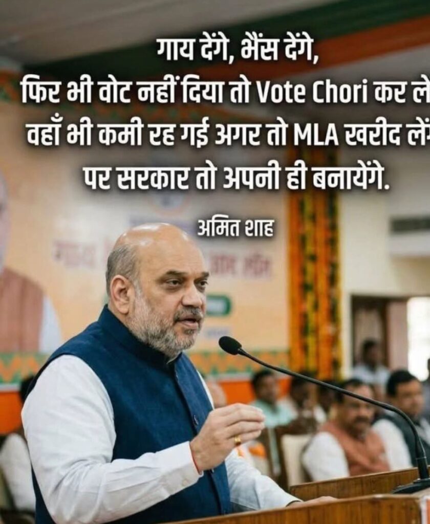 बहीं ग्रहमंत्री के फोटो के साथ लिखा है किसी भी तरह से बने लेकिन सरकार तो अपनी ही बनेगी