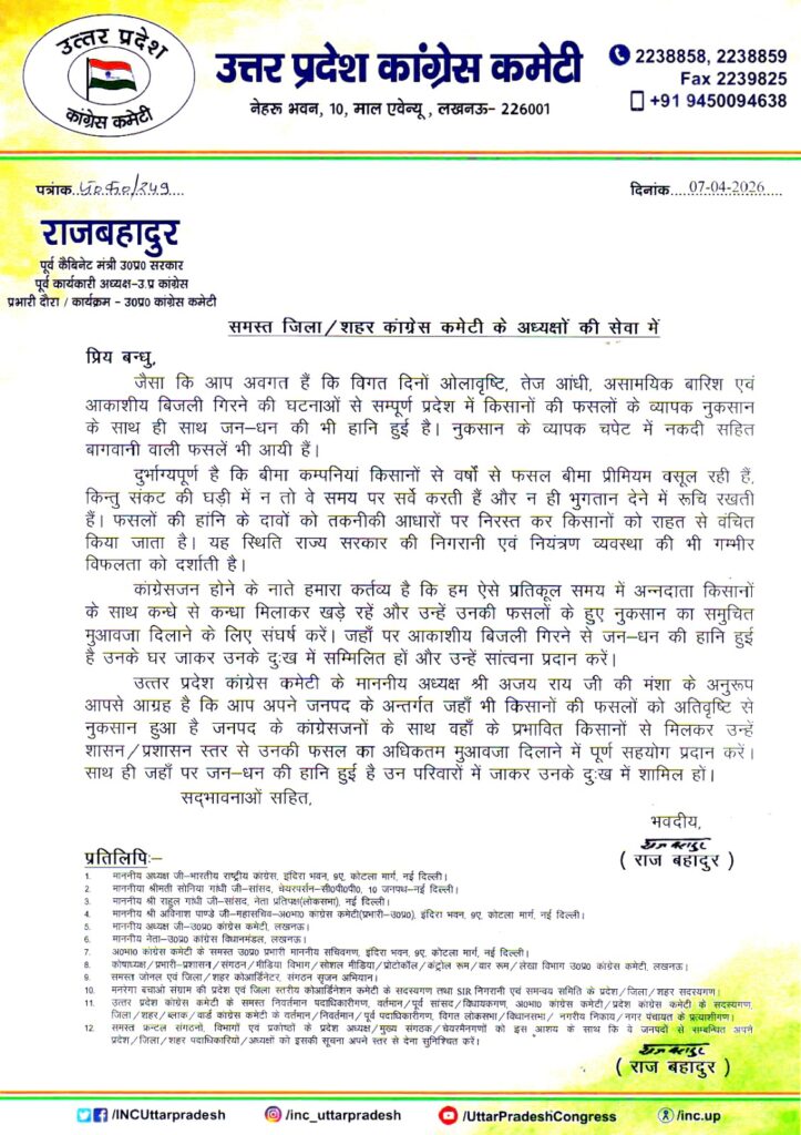 दोस्तो देवीय आपदा वर्षा और ओलावृस्टि नें किसानों की फसलों को भारी छती पहुंचाई है वागवानी को भी बड़ा नुकसान हुआ है लेकिन अभी तक प्रदेशों की सरकारों नें और केंद्र सरकार के साथ विमा कम्पनीयों नें किसानों के लिए एक शब्द भी नहीं बोला उ.प्र. कांग्रेस कमेटी नें प्रदेश के कोंग्रेसियों को निर्देश दिया है की प्रदेश के सभी जनपदों के कोंग्रेसी विशेसकर जिन जनपदों के किसान इस देवीय आपदा से प्रभावित हुए हैं उन जनपदों के कोंग्रेसी प्रभावित किसानों के घर घर जाकर मुलाकात करें और प्रशासन से मिलकर मुआवजा दिलवाएं
