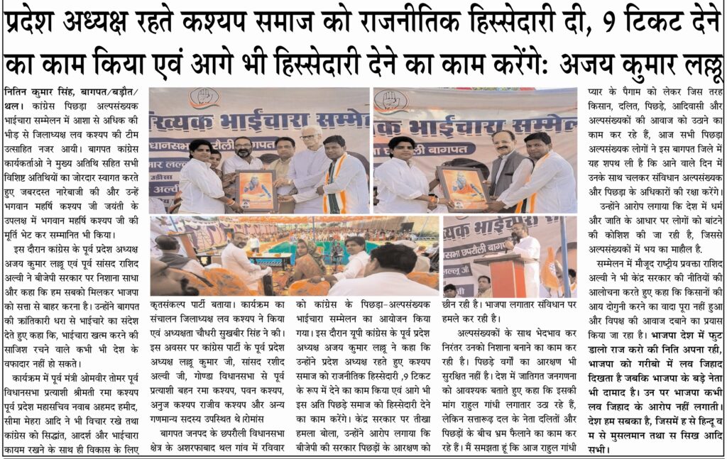 बागपत जनपद के छपरौली विधानसभा क्षेत्र के अशरफाबाद थल गांव में रविवार को कांग्रेस के पिछड़ा-अल्पसंख्यक भाईचारा सम्मेलन का आयोजन किया गया। इस दौरान यूपी कांग्रेस के पूर्व प्रदेश अध्यक्ष अजय कुमार लल्लू ने कहा कि उन्होंने प्रदेश अध्यक्ष रहते हुए कश्यप समाज को राजनीतिक हिस्सेदारी ,9 टिकट के रूप में देने का काम किया एवं आगे भी इस अति पिछड़े समाज को हिस्सेदारी देने का काम करेंगे। केंद्र सरकार पर तीखा हमला बोला, उन्होंने आरोप लगाया कि बीजेपी की सरकार पिछड़ों के आरक्षण को छीन रही है। भाजपा लगातार संविधान पर हमले कर रही है।