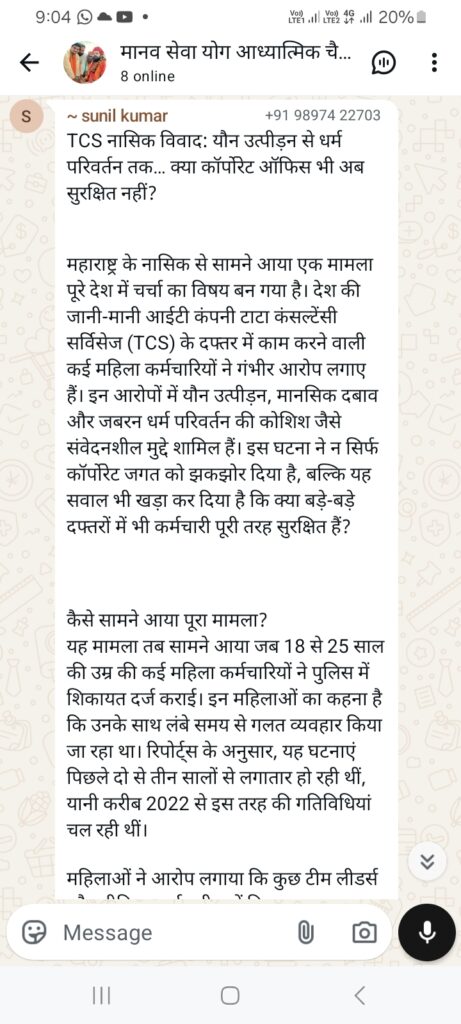 महाराष्ट्र के नासिक से सामने आया एक मामला पूरे देश में चर्चा का विषय बन गया है। देश की जानी-मानी आईटी कंपनी टाटा कंसल्टेंसी सर्विसेज (TCS) के दफ्तर में काम करने वाली कई महिला कर्मचारियों ने गंभीर आरोप लगाए हैं। इन आरोपों में यौन उत्पीड़न, मानसिक दबाव और जबरन धर्म परिवर्तन की कोशिश जैसे संवेदनशील मुद्दे शामिल हैं। इस घटना ने न सिर्फ कॉर्पोरेट जगत को झकझोर दिया है, बल्कि यह सवाल भी खड़ा कर दिया है कि क्या बड़े-बड़े दफ्तरों में भी कर्मचारी पूरी तरह सुरक्षित हैं?