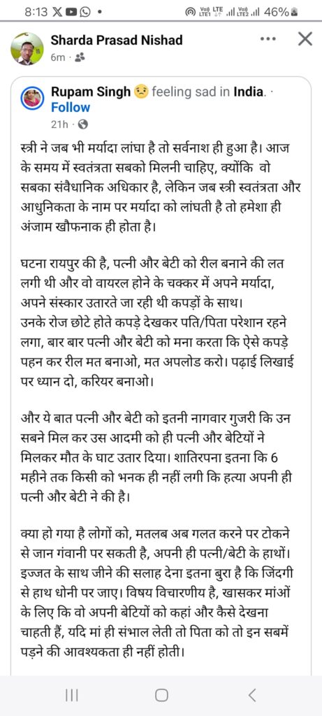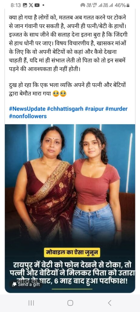 घटना रायपुर की है, पत्नी और बेटी को रील बनाने की लत लगी थी और वो वायरल होने के चक्कर में अपने मर्यादा, अपने संस्कार उतारते जा रही थी कपड़ों के साथ।