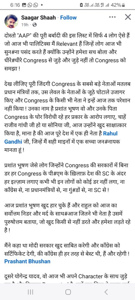 देख लीजिए पूरी जिंदगी Congress के सबसे बड़े नेताओं मतलब प्रधान मंत्रियों तक, उस लेवल के नेताओं के जूठे घोटाले उजागर किए और Congress के किसी भी नेता ने इन्हें आज तक परेशान नहीं किया ! उनका नाम है प्रशांत भूषण वो और उनके पिता Congress के घोर विरोधी रहे हर प्रकार के आरोप लगाए, चाहें राजीव गांधी जी हो या सोनिया जी, आज उन्होंने खुद साक्षात्कार किया है, माना है की आज पूरे देश में एक ही नेता है Rahul Gandhi जी, जिन्हें मैं सही माइनॉ में एक सच्चा जन#नायक मानता हूं !