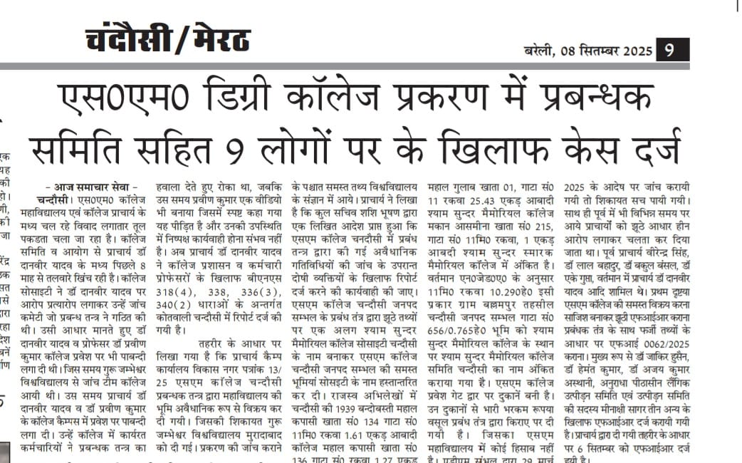 इसके अलावा यह भी आरोप लगाया गया है कि डॉक्टर दानवीर सिंह यादव प्राचार्य, डॉ प्रवीण कुमार प्रोफेसर के विरुद्ध साजिश करके झूठी एफ आई आर संख्या 0062/2025 एवं अन्य रिपोर्ट दर्ज करने, लैंगिक उत्पीड़न एवं आंतरिक परिवाद समिति द्वारा प्रबंधतंत्र के साथ हमसाज होकर झूठी रिपोर्ट देकर दोषी घोषित करने व प्रबंधतंत्र से हमसाज होकर फर्जी तथ्यों के आधार पर निलंबित/बर्खास्त कराए जाने में समस्त पदाधिकारी एवं सदस्य प्रबंधतंत्र एस. एम. कॉलेज, चंदौसी, श्यामसुंदर मेमोरियल कॉलेज समिति, चंदौसी तथा लैंगिक उत्पीड़न उत्पीड़न एवं आंतरिक परिवाद समिति के सभी सदस्य अन्य अज्ञात के विरुद्ध रिपोर्ट दर्ज कर कानूनी कार्रवाई किये जाने की प्रार्थना की गई है।